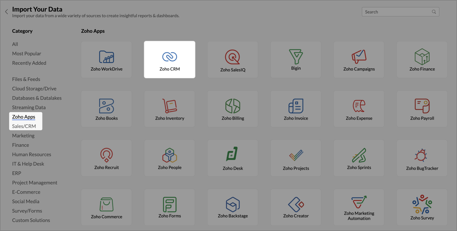- Navigate to the Zoho Apps tab and select Zoho CRM from the available applications.