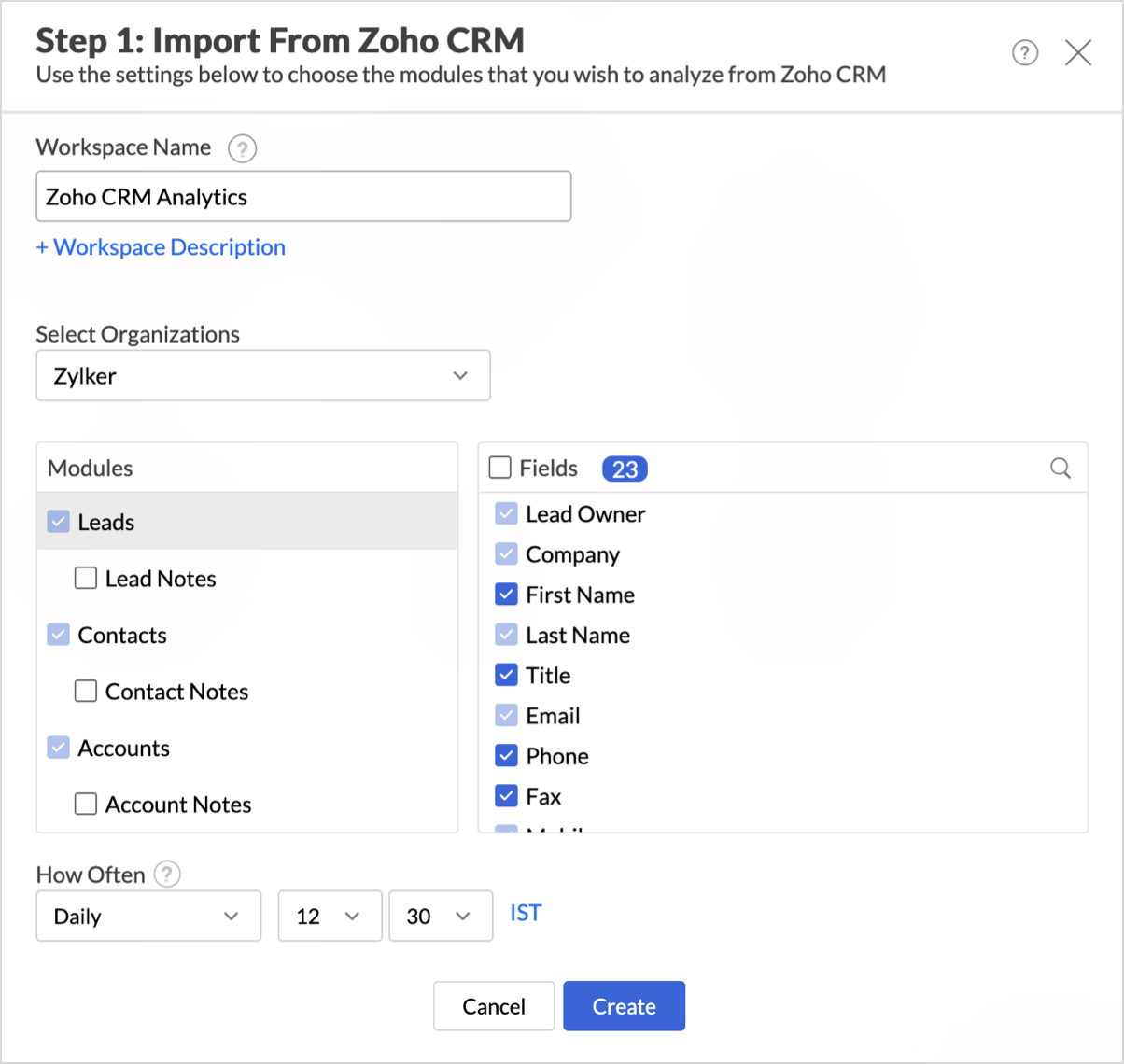 - From Zoho Analytics Configuration dialog, select the modules and fields to sync. Mandatory fields are preselected and cannot be cleared.