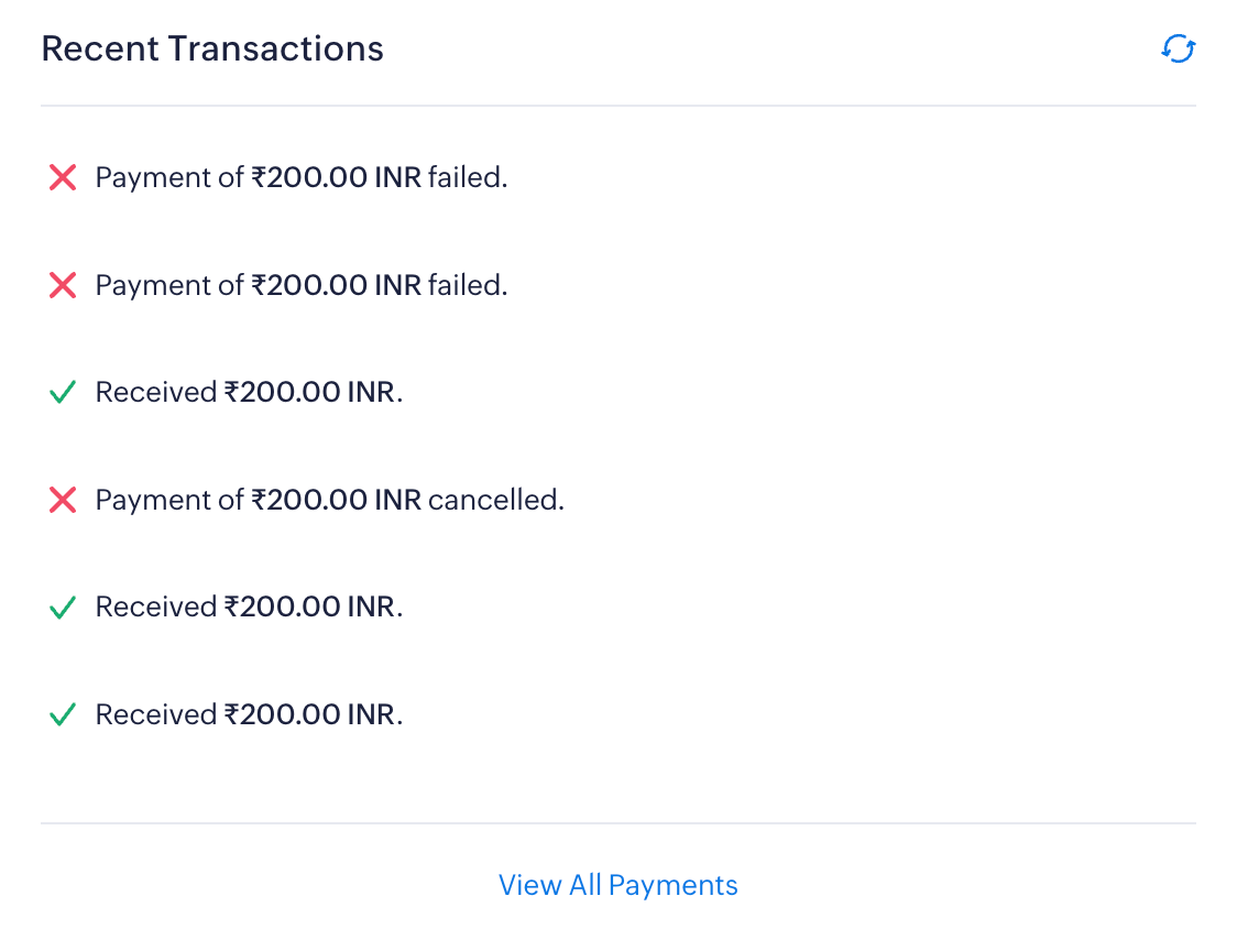 You can select a single transaction to view the details or click the View All Payments option to view the payments received directly in the Payments module. You can also click the Refresh option available on top of the table to fetch all recent transactions.