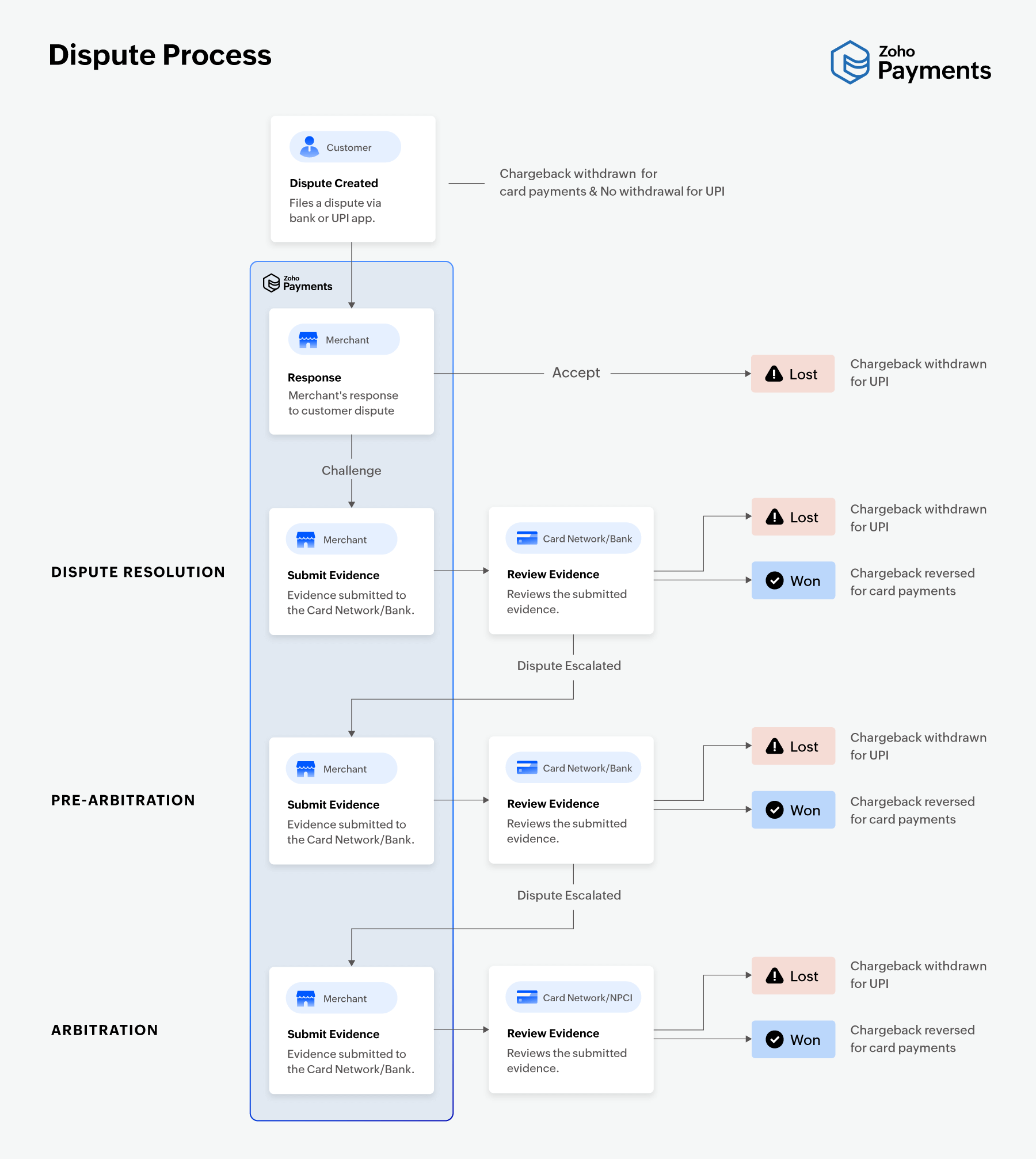 Once the dispute is notified to the merchant, a chargeback is deducted from the merchant’s Zoho Payments account for card payments. However, no amount is withdrawn for UPI transactions until the dispute is lost.