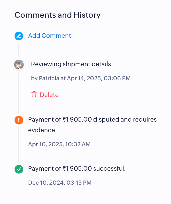 A log of all the actions performed on your transaction is tracked under this section. Every step, right from payment collection until the dispute has been closed, can be tracked here. Users will also be able to add comments for internal reference.