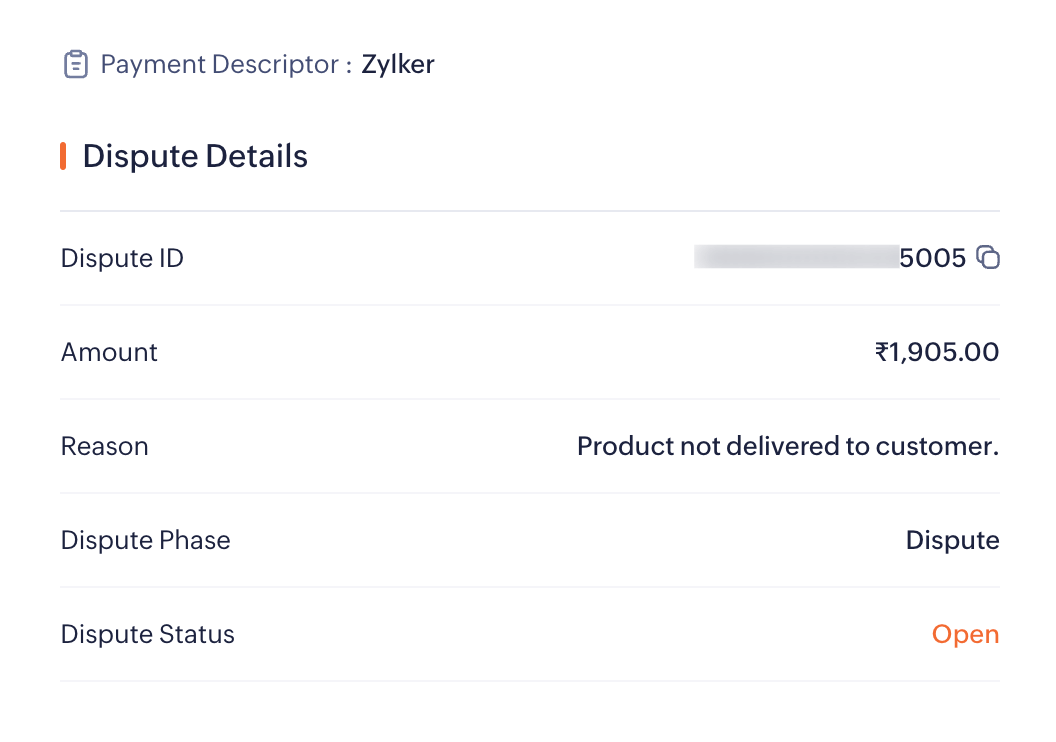 This section contains the details of the relevant payment that was disputed. It includes the Payment Descriptor you had provided in your settings, the Amount Paid by the customer, the Platform Fee, the Disputed amount, and the final Net Amount after disputes or refunds.