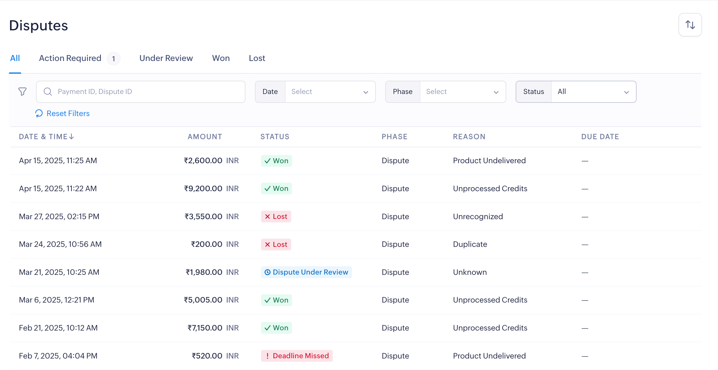 The list view provides the basic details of all disputes, such as the Dispute Date, Amount, Status, Reason, and Customer Details.