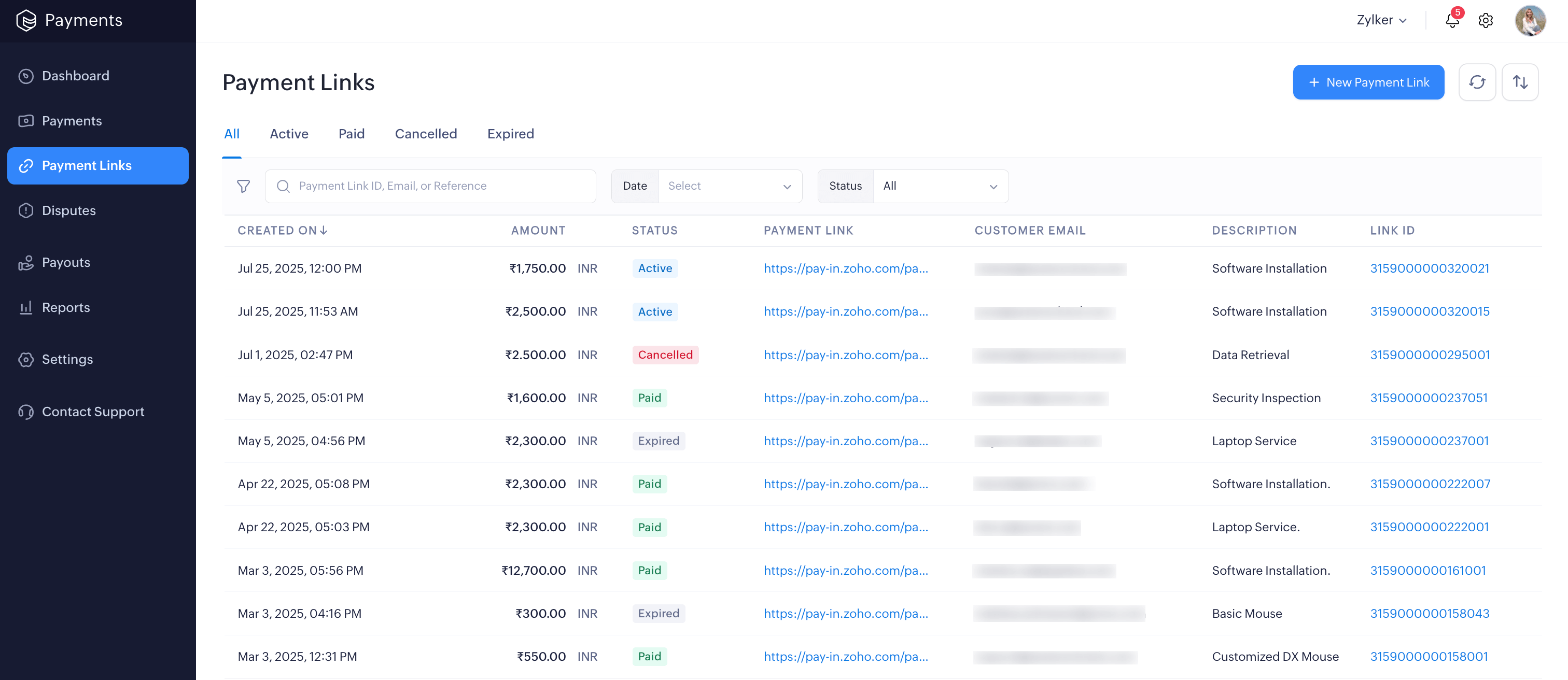 Payment links simplify online payments, making it a quick, secure, and no-code way to accept payments from your customers. Whether you’re offering a service, selling goods, or managing a business, you can easily generate a unique payment link in Zoho Payments and share it with your customers, even if you don’t have a digital platform or use any Zoho Finance app.