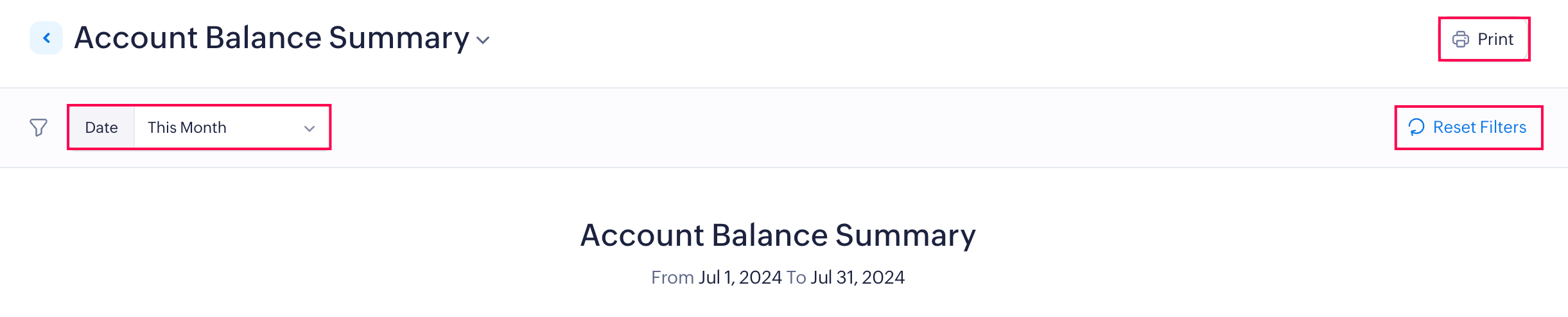 You can filter and view reports based on predefined date ranges such as month and year, or select a custom date range. You can also reset the filter to its default view by clicking the Reset Filters button.
