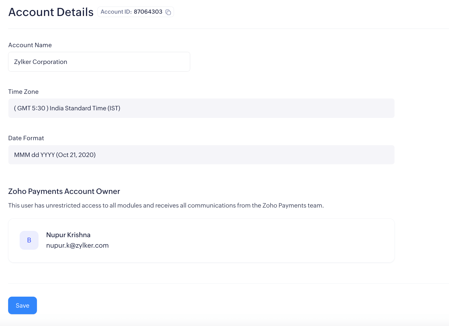This section displays key information about your Zoho Payments account, such as your account name, time zone, and date format.