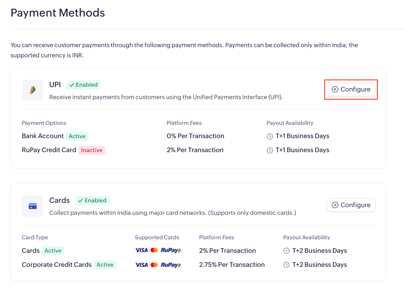 To accept UPI payments via RuPay credit cards, you’ll have to enable it manually under Cards > Configure > Enable RuPay Credit Cards.
