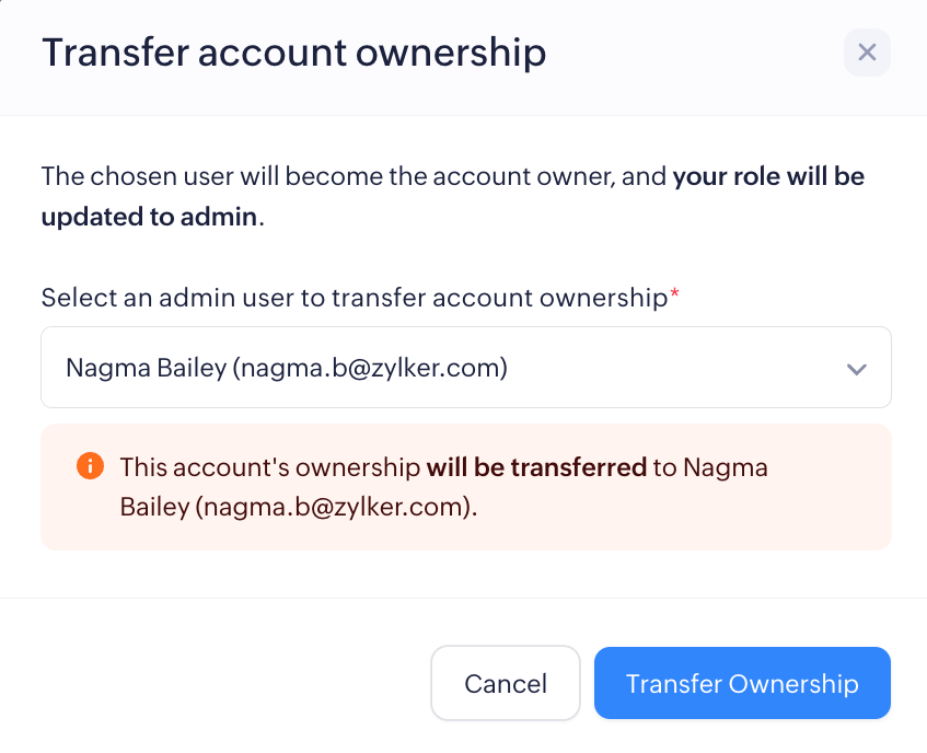 Insight: Zoho Payments allows only one account owner. So when you transfer your account’s ownership, your role will automatically be updated to admin.
