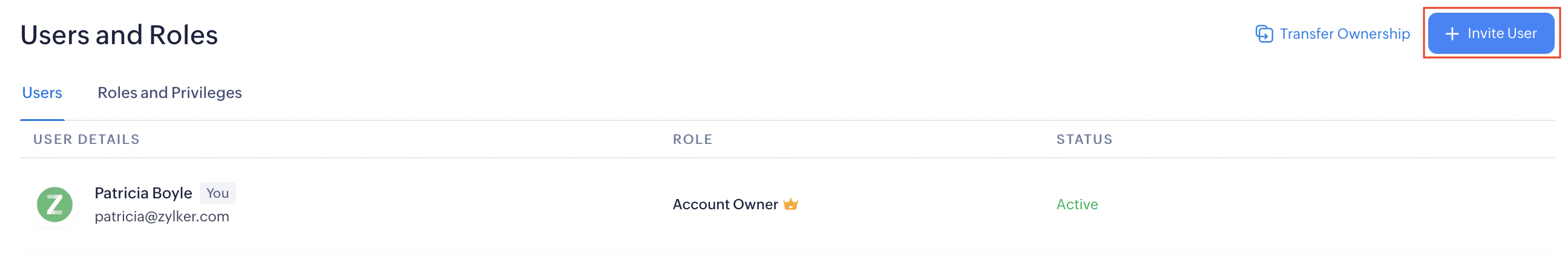 The account owner in Zoho Payments is the only user with unrestricted access to all modules and receives all communications from the Zoho Payments team.