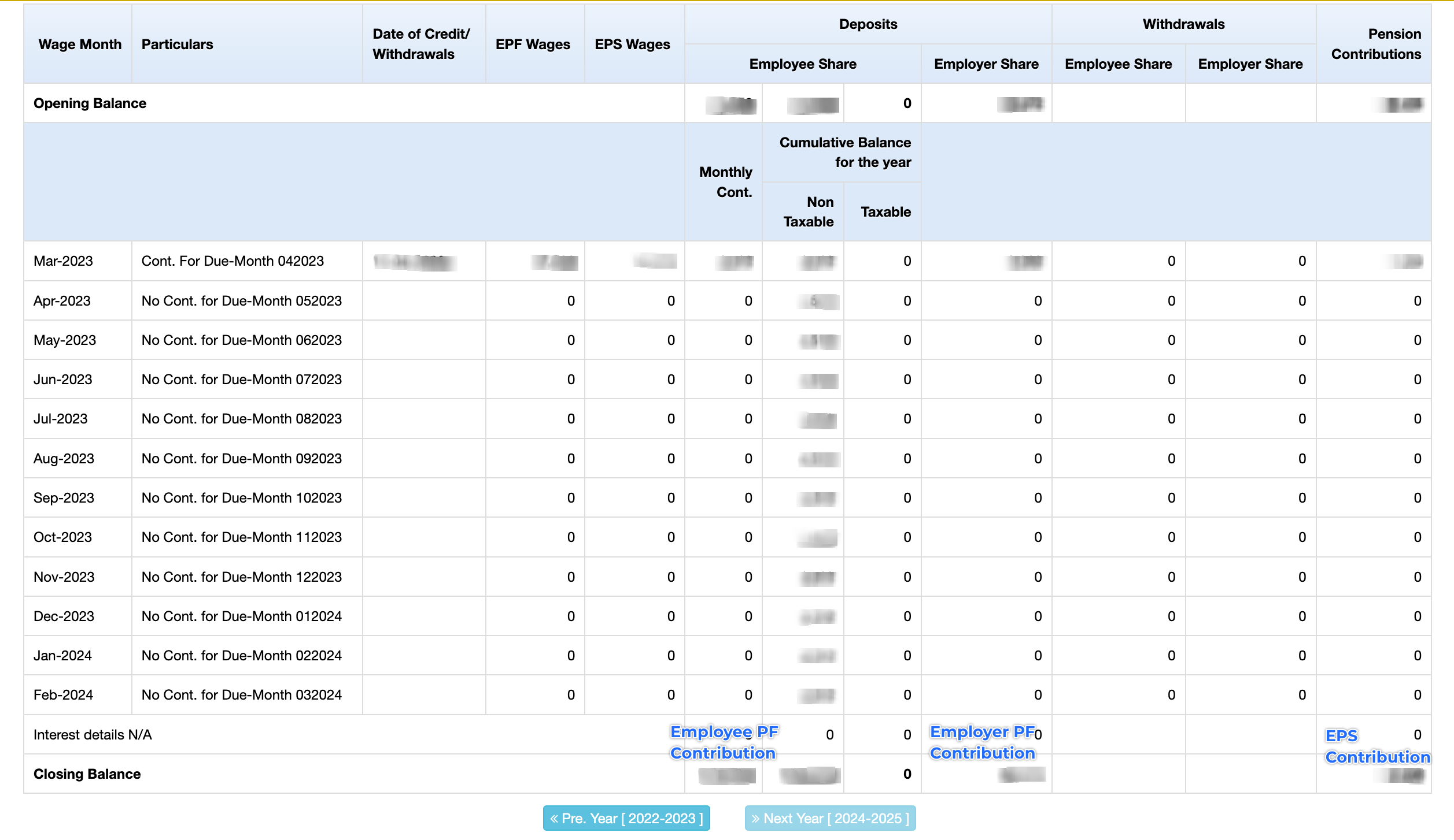 - Enter your employee and employer contribution towards EPF and EPS as per the closing balance mentioned on your EPFO passbook.