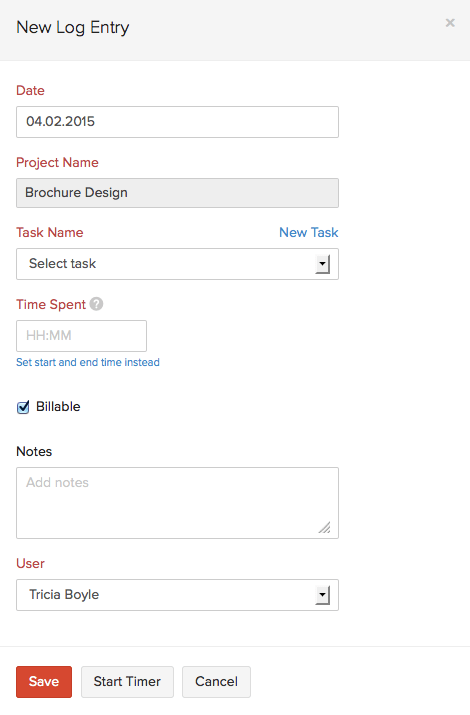 • The time log entry will appear. Fill in the required details and save.