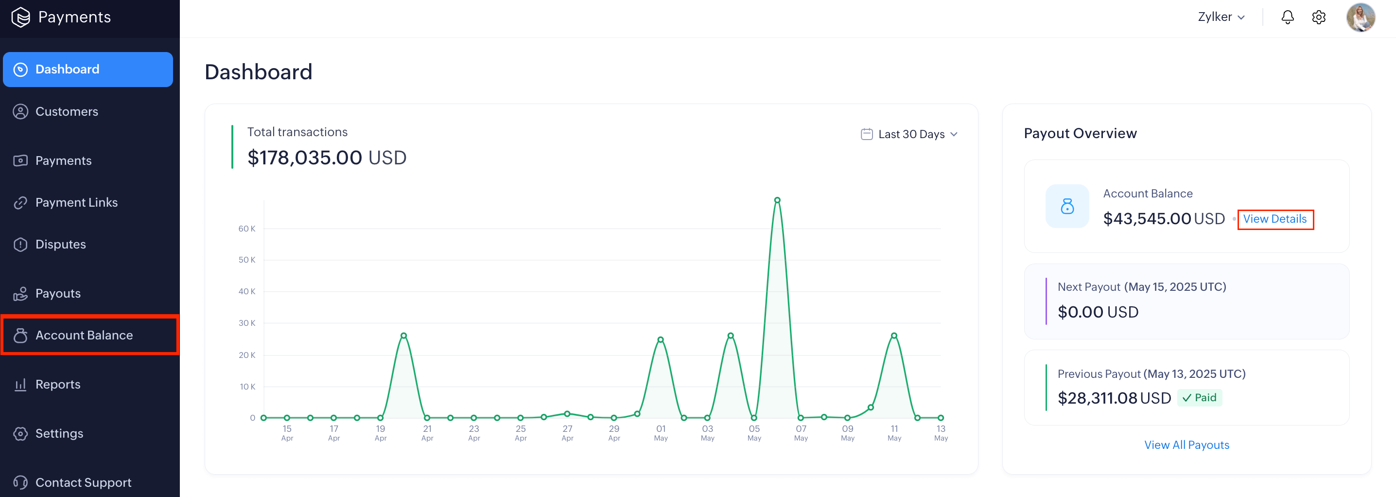 You can also view the balance by clicking View Details next to Account Balance in the Dashboard or Payouts module.