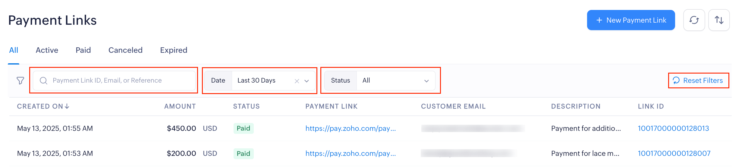 - Filter transactions: Use the search bar or select filters from the drop-down to filter the links by Link ID, Email, Reference, Date, or Status.