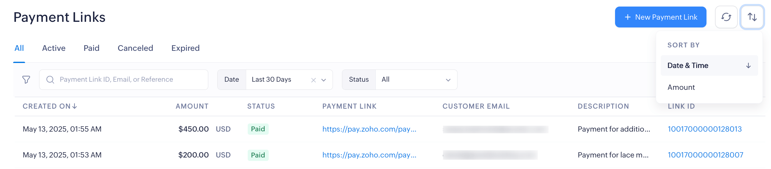 Sort the payment links by Date & Time or Amount in ascending and descending order.