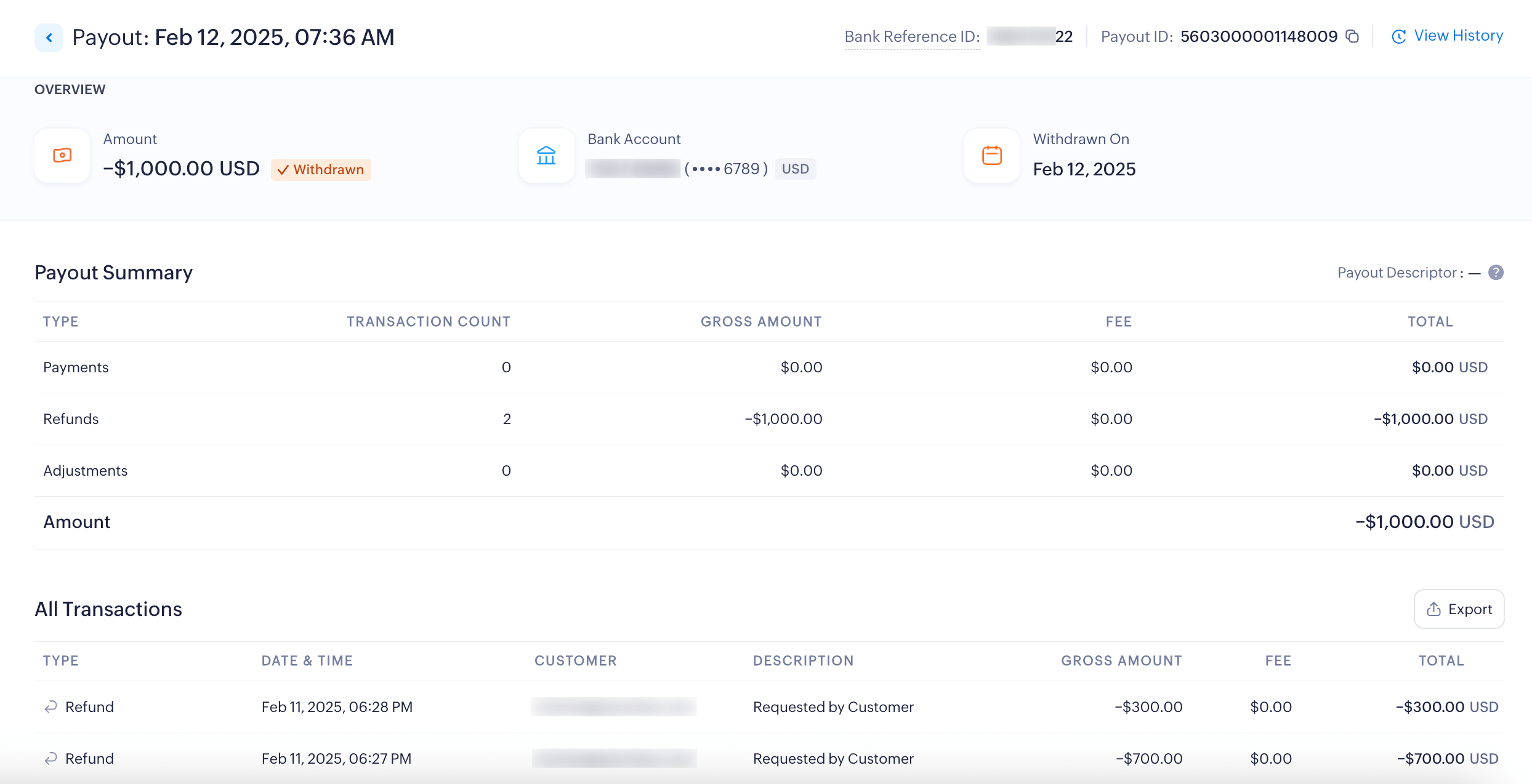 Click on a Withdrawal to get a detailed overview of the transaction. The Payout Summary displays the withdrawn amount, calculated based on the payments, refunds, and adjustments. You can also view each transaction that makes up the summary in the All Transactions section.