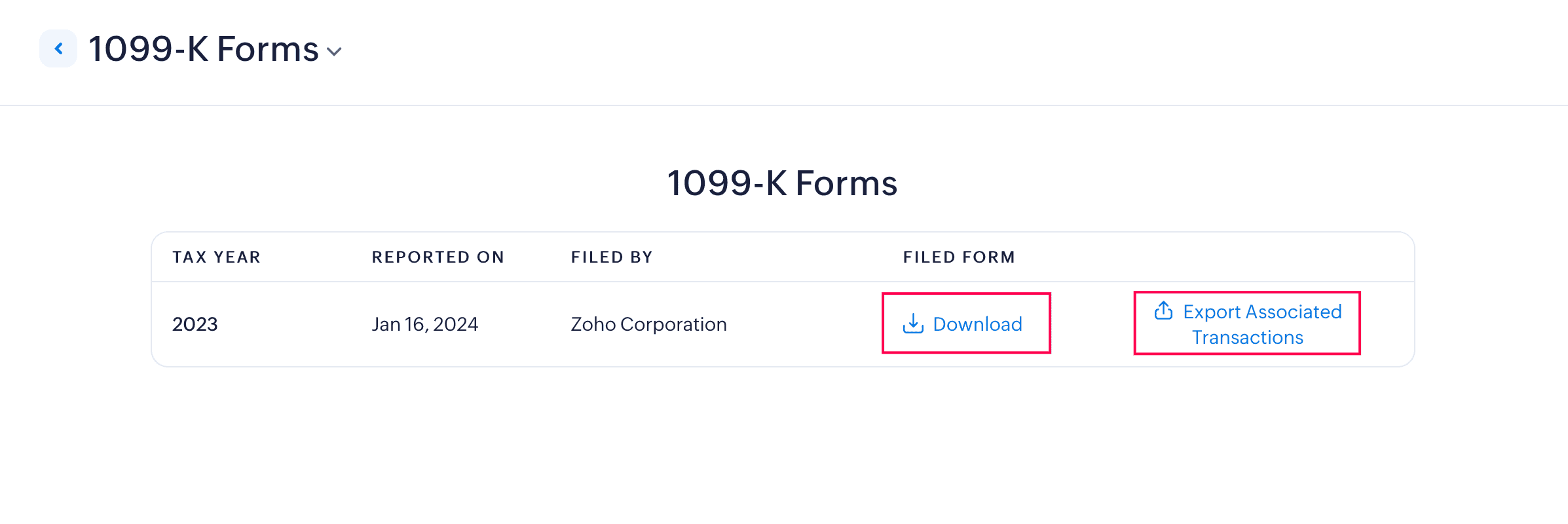 Zoho Payments notifies you when a 1099-K Form is filed and allows businesses to download it from the app as per the Terms for Electronic Delivery of 1099-K Form .