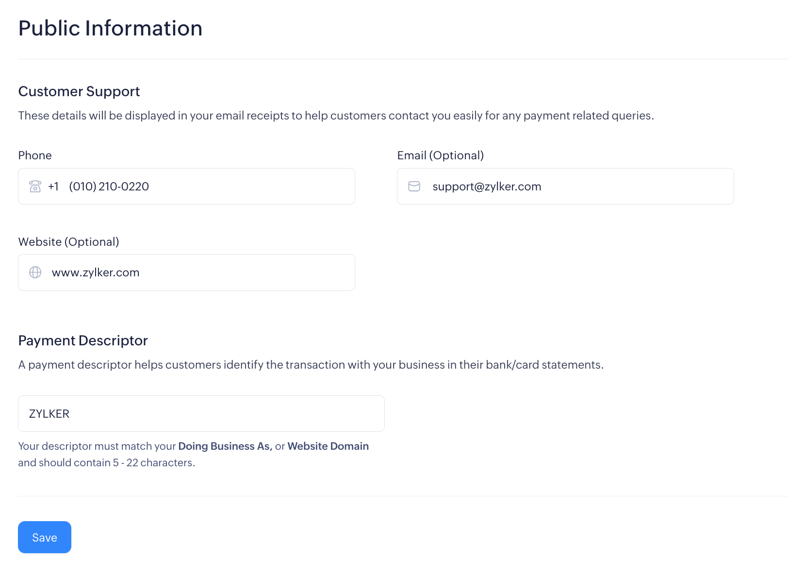 This section displays the contact details and payment descriptor you configured while setting up your Zoho Payments account. If at any point your contact information changes, you can update it here.