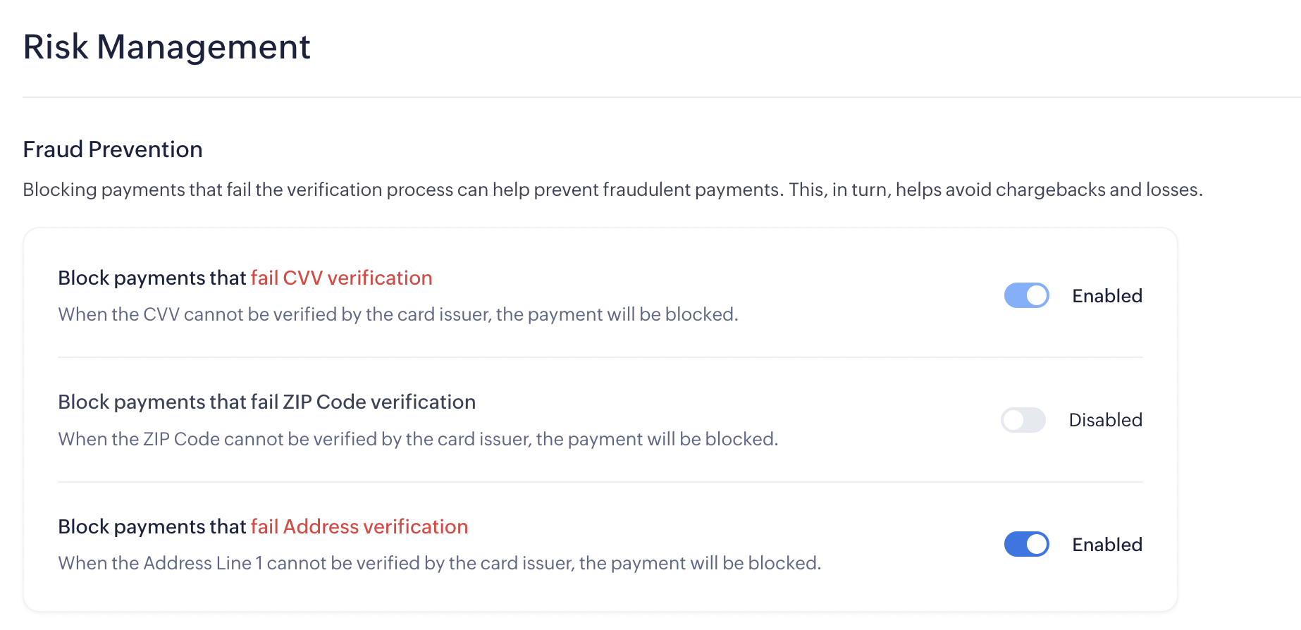 - Block payments that fail Address Line 1 verification.