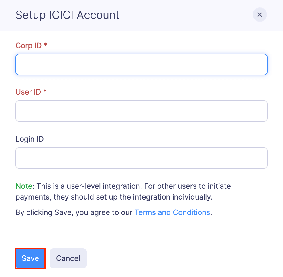 6. A popup will appear, and you can enter the Corp ID and User ID of your organization’s ICICI account.