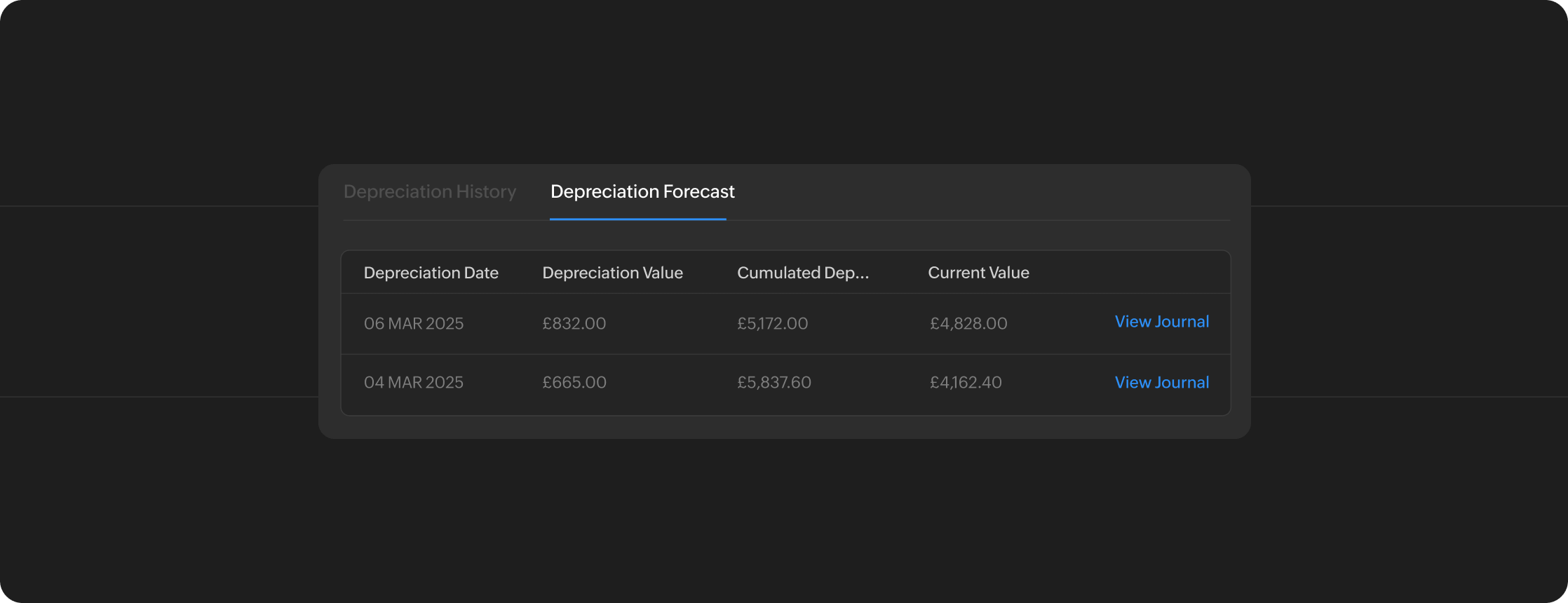 Visualize asset depreciation trends over time with intuitive charts.