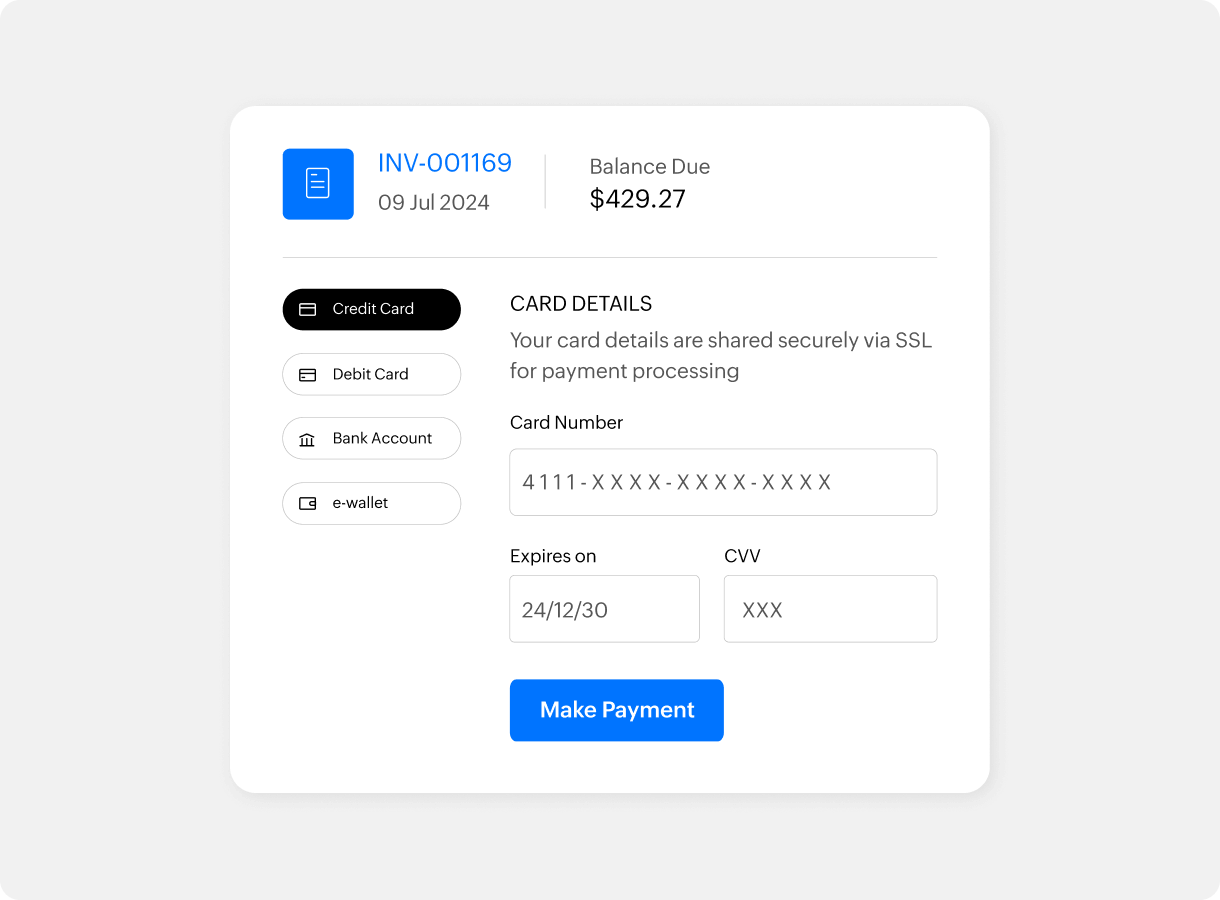 Offer your customers multiple ways to pay you, including credit and debit cards, ACH transfers, and e-wallets.