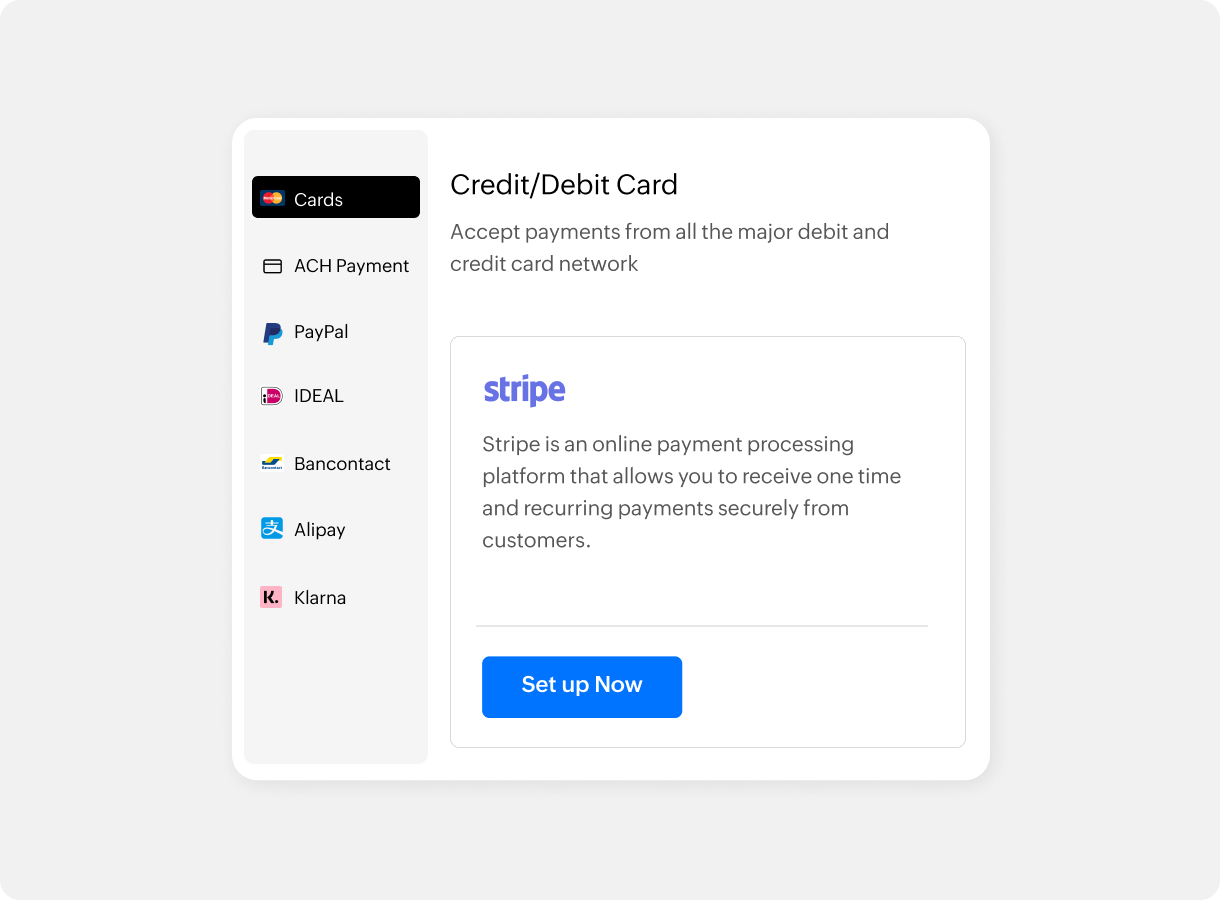Integrate with your preferred payment gateway for hassle-free payment collection. Automate payment reminders, send thank you letters, and do more with Zoho Invoice.