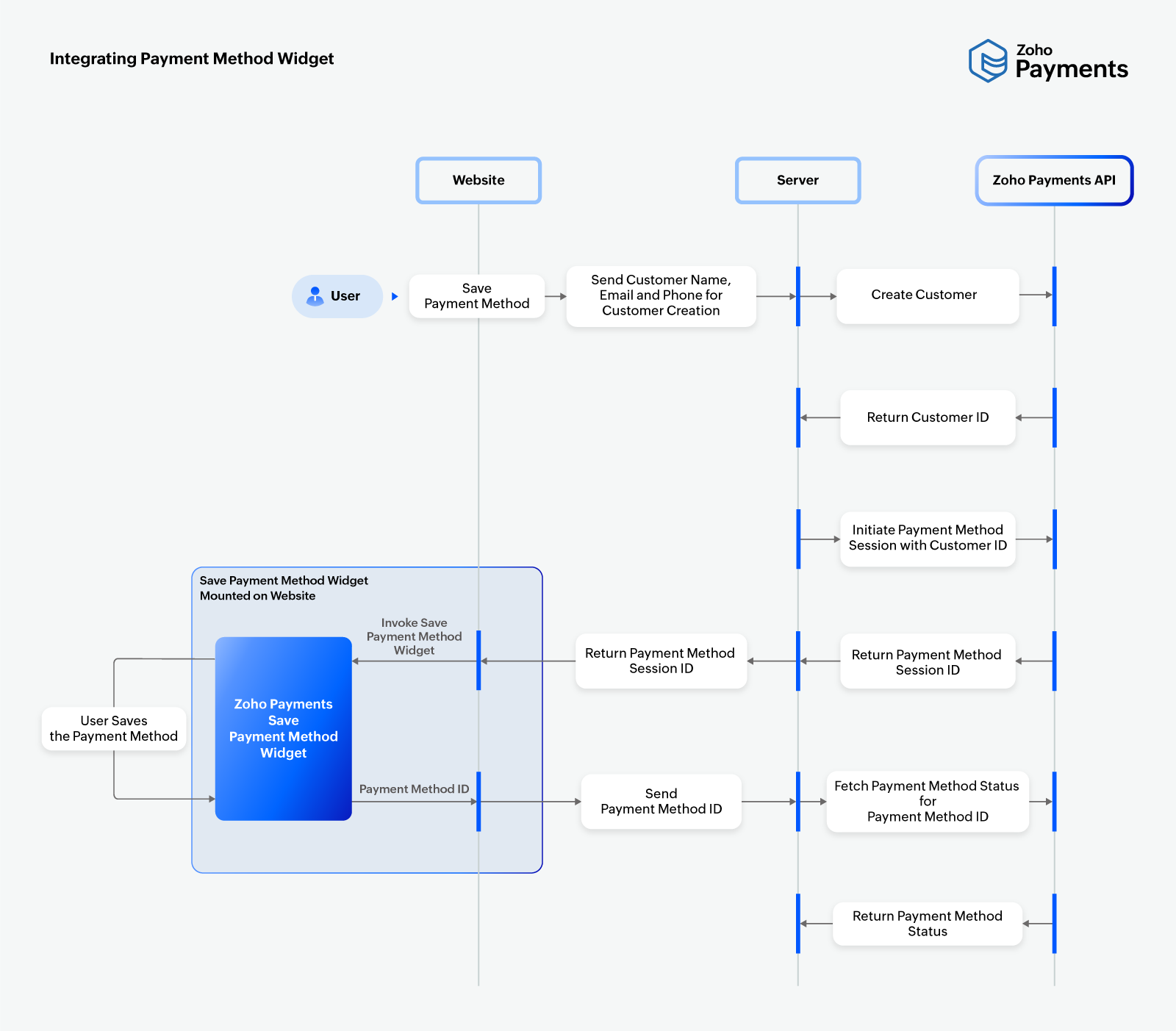 Here’s an outline of the end-to-end process for saving customer payment methods using Zoho Payments' payment method widget.