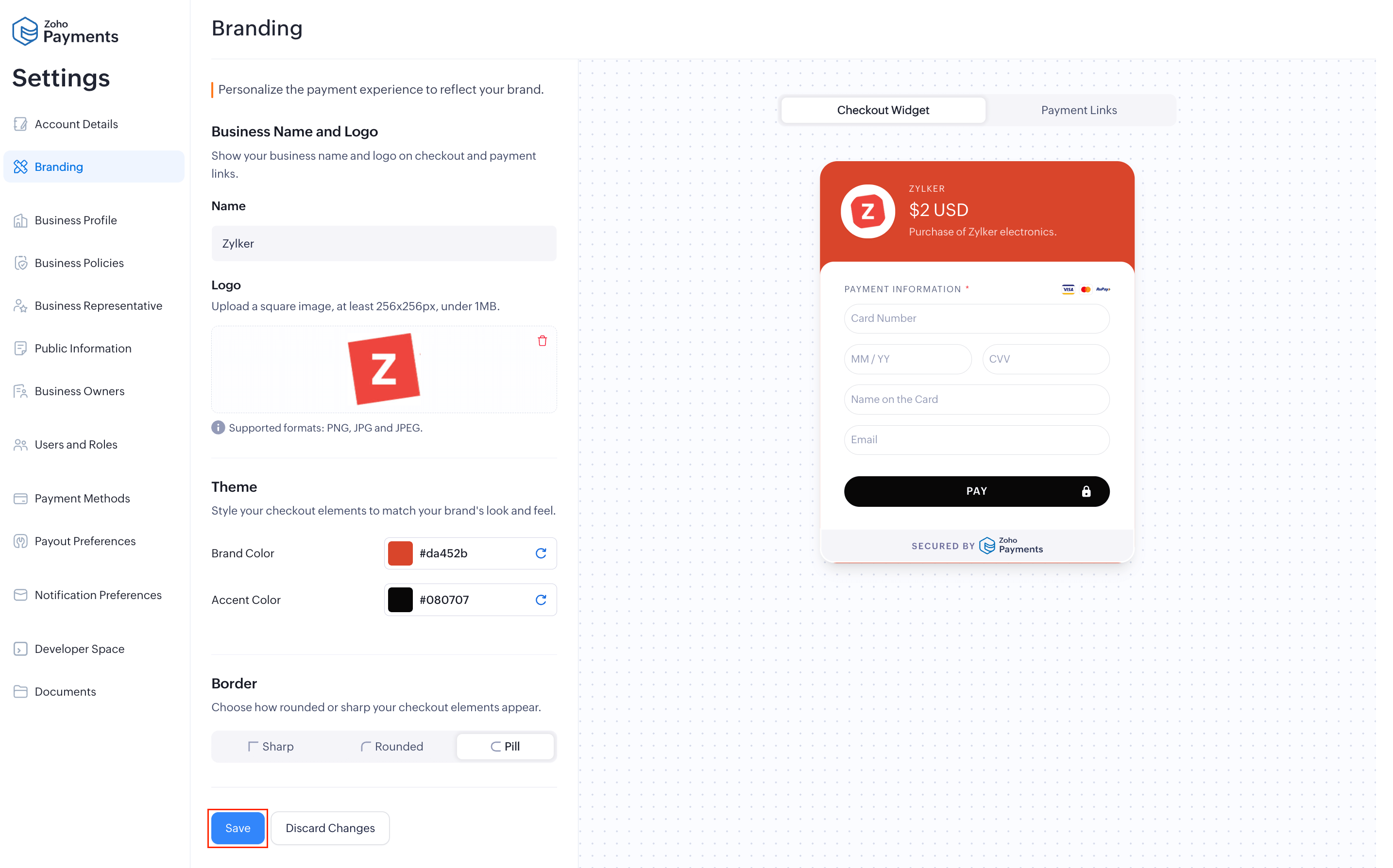 Zoho Payments allows you to reflect your brand’s identity during every transaction by customizing your name, logo, and colors displayed on the checkout widget and payment links. This provides a professional payment experience, enhances your brand visibility, and reassures customers that they are making the payment to the right business.